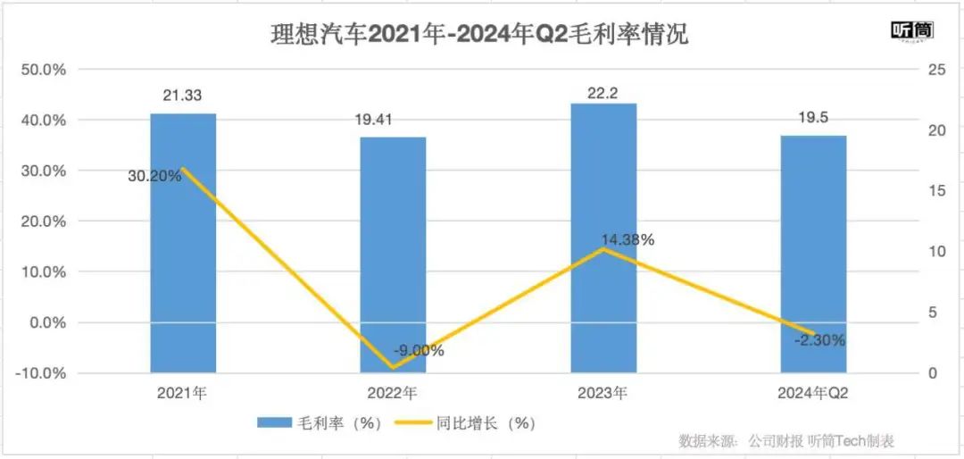 财报显示,今年二季度,理想汽车毛利为62亿元,较2023年第二季度的62亿元减少0.9%;毛利率为19.5%,而2023年第二季度为21.8%,同比下跌2.3个百分点。