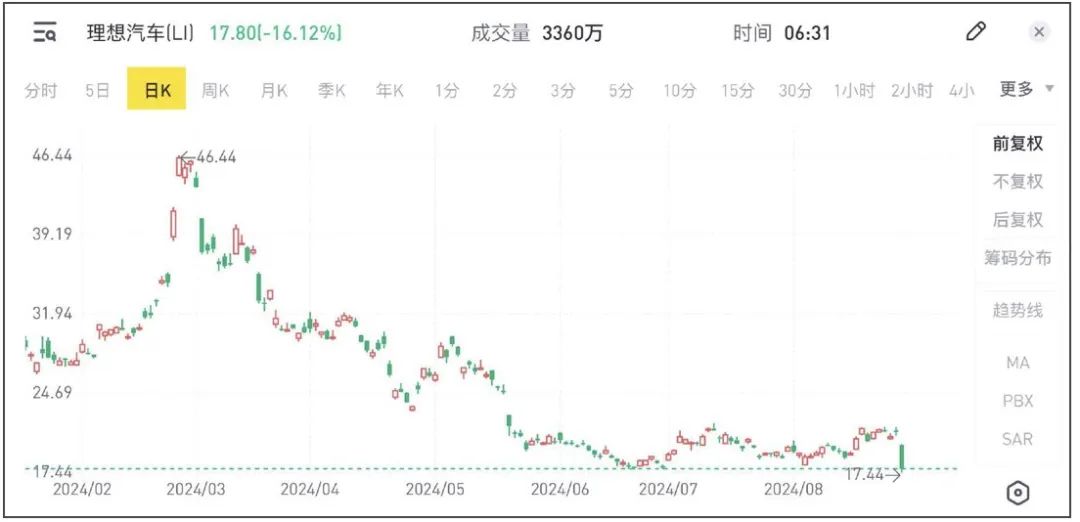 或受此影响,财报发布后,截至美东时间8月28日美股收盘,理想汽车股价跌16.12%至17.8美元/股,总市值188.9亿美元,较8月27日减少了36.25亿美元。