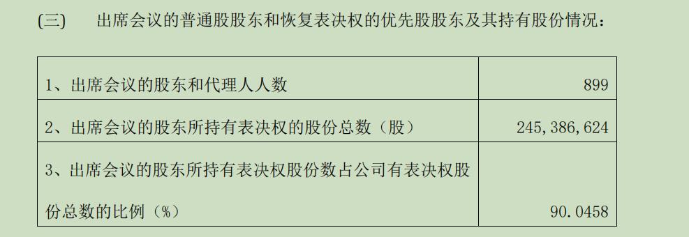 值得一提的是,此次出席会议的股东和代理人人数多达899人,出席会议的股东所持有表决权股份数占公司有表决权股份总数的比例高达90.0458%。