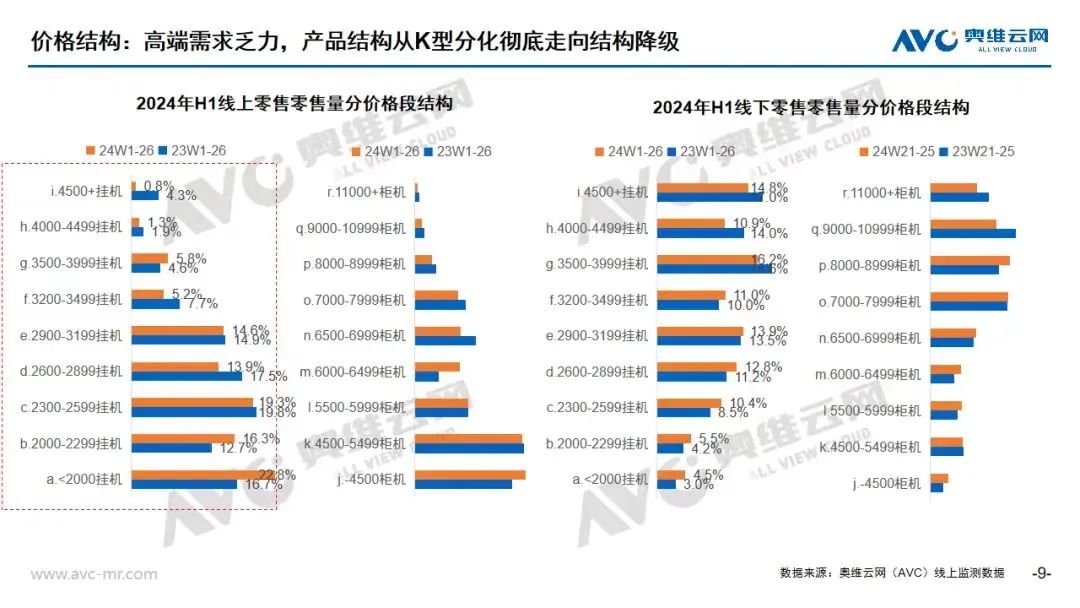 以线上1.5匹挂机为例,上半年2000元以下产品销量占比达到22.8%,同比提升6.1个百分点。线下1.5匹挂机来看3500元以上产品结构占比从同期的49.6%下滑至41.9%。