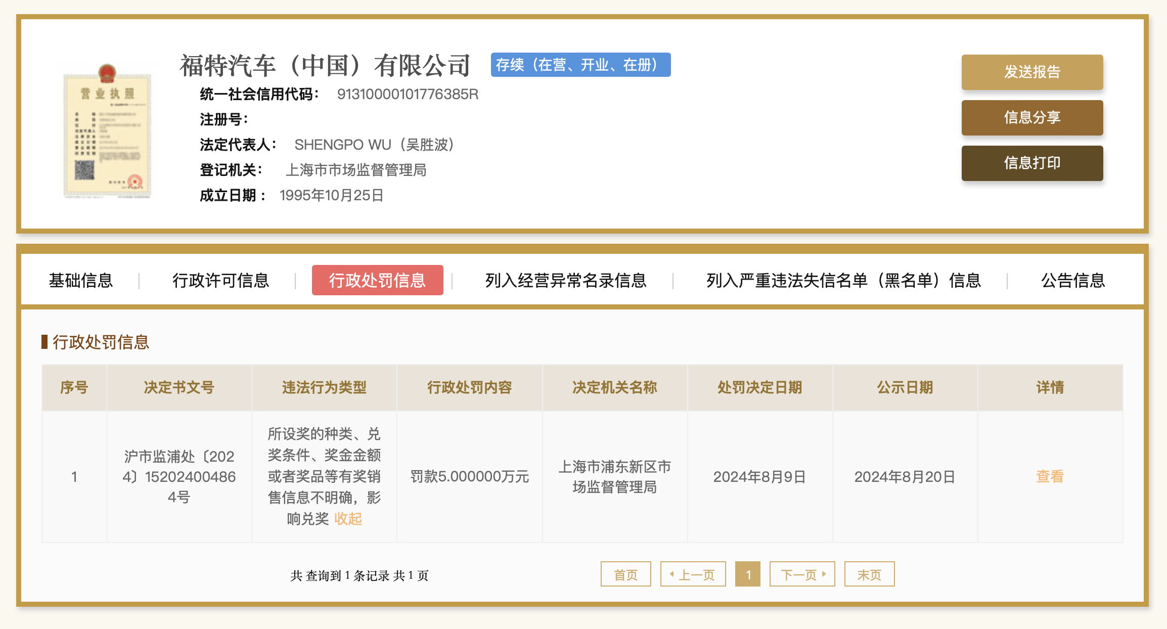 天眼查经营风险信息显示,近日,福特汽车(中国)有限公司因有奖销售信息不明确影响兑奖,被上海市浦东新区市场监督管理局罚款5万元。处罚事由显示,2022年5月,当事人在其微信公众号开办了标题为“万人迷养成计划”的有奖促销活动,活动具体内容:“今日互动今天你想怎么搞气氛?评论区恩爱秀出来点赞最高的三位小伙伴可赢取520心动礼品一份(活动至5月25日17:00截止)”,当事人未按照规定公示奖品价格、品名、种类等信息。今年7月,当事人已删除相关内容。