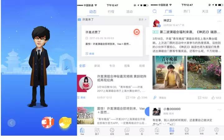 2. 强运营。不同于以往的明星定制APP,在Vae+ APP上粉丝不但可以让许嵩的卡通形式“许老师”送礼物、唱歌、陪聊,还可以有机会获得来自许嵩的点赞或评论。Vae+上亦鼓励粉丝的内容输出,以信息流的方式发布帖子与其他用户开展互动。