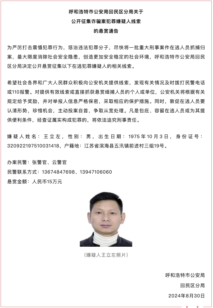 8月30日,呼和浩特警方发布悬赏通告,公开征集诈骗案犯罪嫌疑人线索。对提供有效线索或直接抓获悬赏缉捕人员的个人或单位,公安机关将根据有关规定给予奖励,并对举报人信息严格保密,采取相应的保护措施。