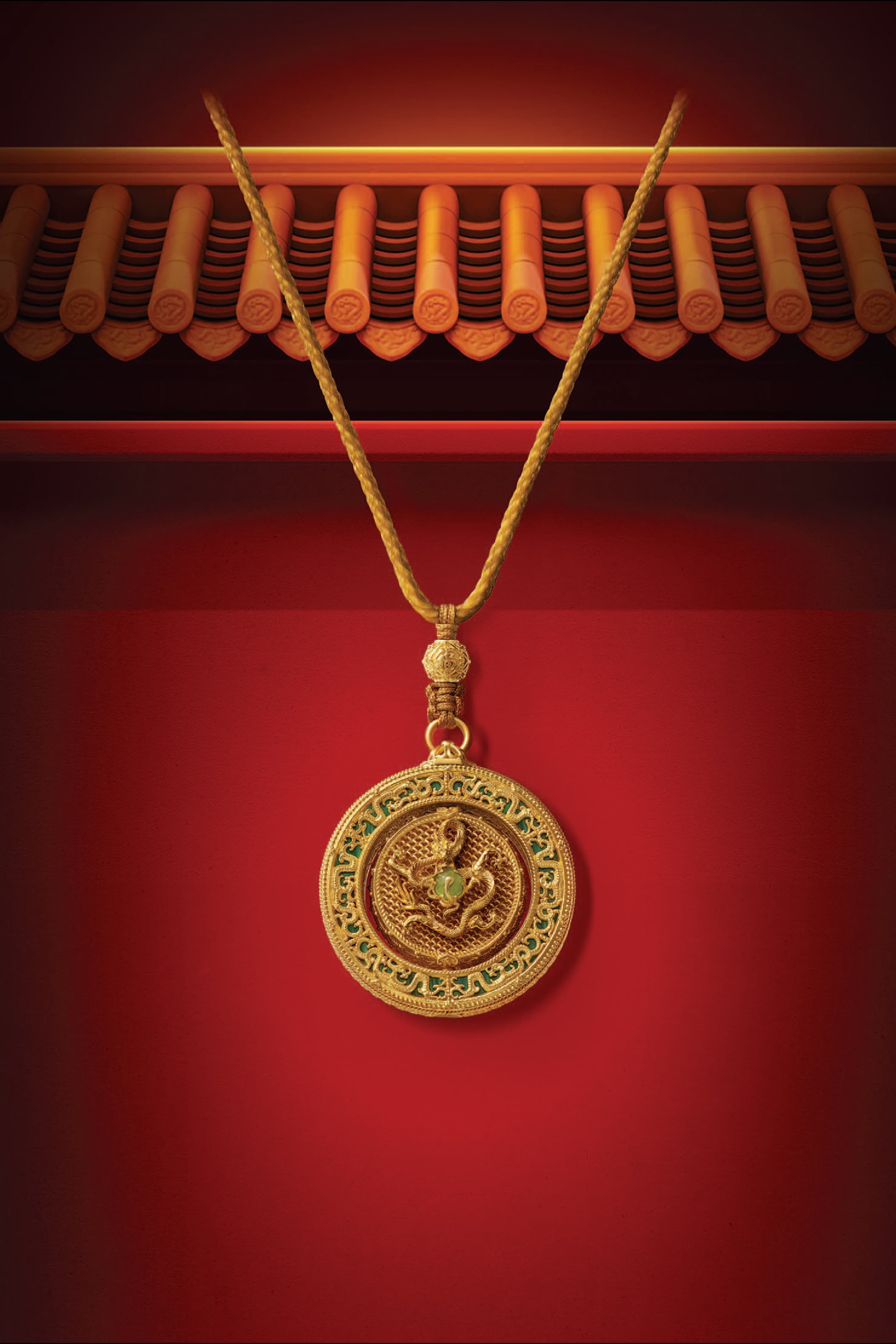 以故宫博物院藏清·金漆彩画云龙纹搏拊鼓为灵感的“龙腾鼓乐” 黄金吊坠正是这样一件可佩戴的艺术品。吊坠外层为金镶玉圆环,内部则是一个可旋转的圆环,一侧刻有腾云驾雾的龙,另一侧刻有双龙戏珠的图案。吊坠采用中国传统黄金工艺——黄金花丝工艺、粒状镶嵌工艺制作,镶嵌了绿玉、钻石和孔雀石等多种珍贵宝石。这件色彩斑斓的臻品寓意“吉祥如意”,是文化传承与工匠精神的精彩演绎。