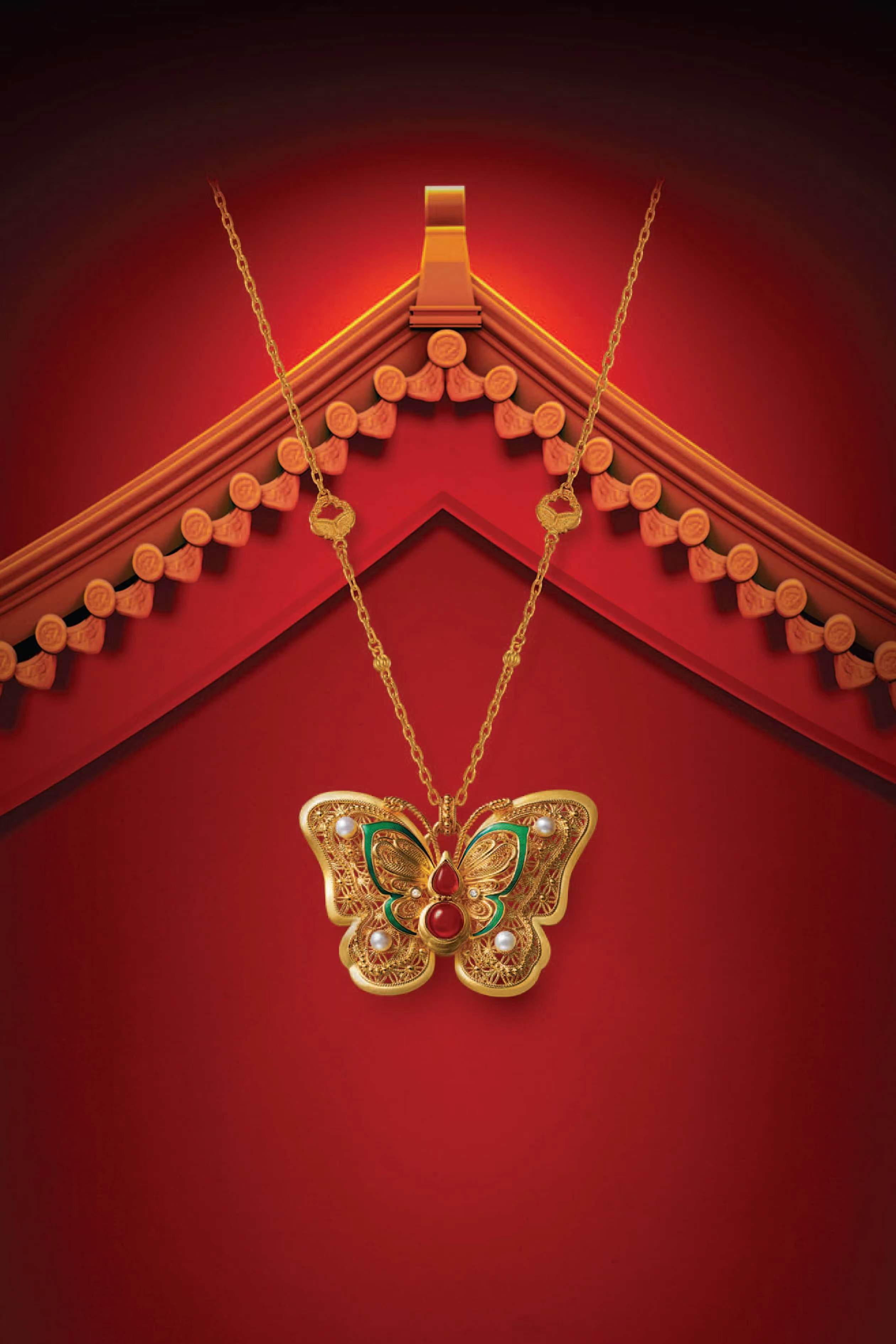周大福故宫系列的另一代表作是“玲珑花蝶”黄金吊坠,该作品栩栩如生地诠释了故宫博物院藏宋·《海棠蛱蝶图》页画作。受蝴蝶精致形态的启发,这款精巧的吊坠由三层独特设计组成:外层为抛光金边搭配网状黄金花丝工艺;中层为珠饰边缘、两侧各镶嵌两颗珍珠;内层以花丝漩涡图案为中心,边缘装饰有绿色珐琅和两颗圆形钻石。吊坠中心还镶嵌有红碧玺和珍珠。这款臻品由大师工匠精心打造,象征和谐、吉祥、健康与长寿。