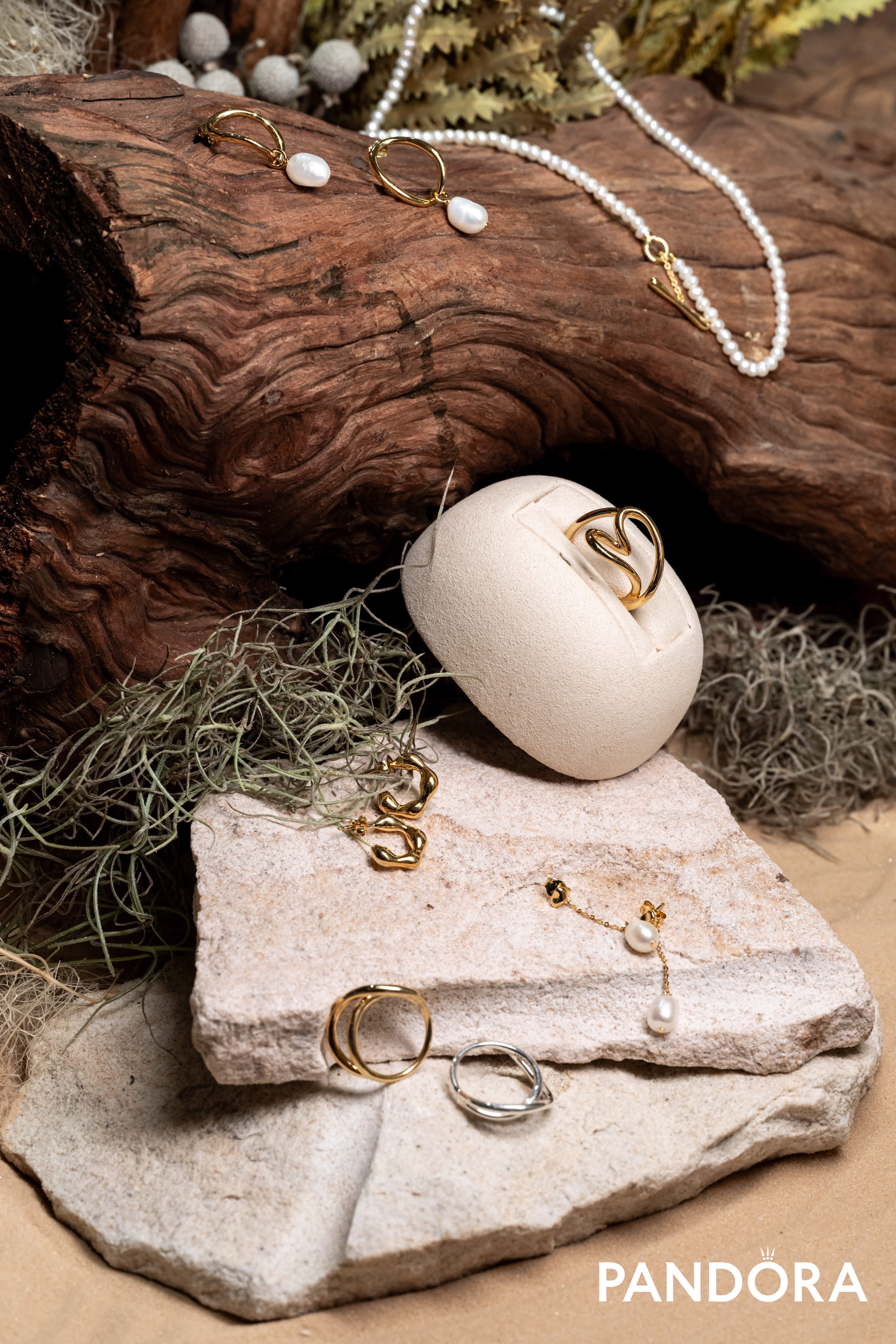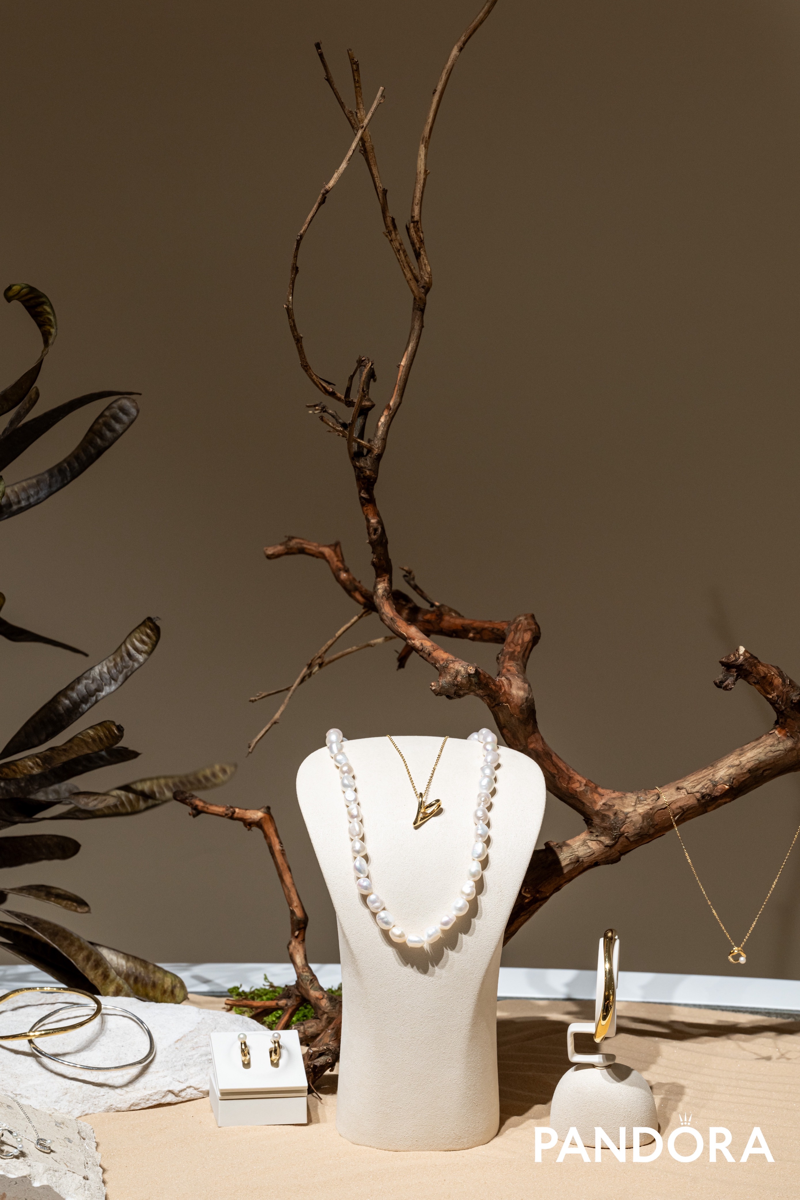 产品陈列区是此次预览活动的亮点,以鎏金细沙还原沙漠的涟漪纹理、用风干的树木、枝叶、花朵、石块模仿天然生态,全新在新品展览现场,潘多拉以鎏金细沙还原沙漠的涟漪纹理、用风干的树木、枝叶、花朵、石块模仿天然生态,把“PANDORA ESSENCE”系列新作置于仿造自然景观之中,以展现该系列作品设计是从自然风景中获得的灵感。 整个系列以万物之形与流体线条为灵感,由“天性”和“不哭”两大主题组成。“天性”主题聚焦于用金属材质表达自然之形,而在“不哭”主题中,则是以不规则形状的巴洛克珍珠来诠释独一无二的自我。
