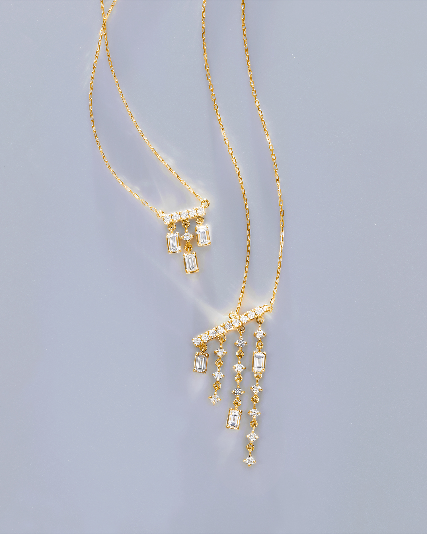 作为本季重磅力作,chandelier baguette grand系列精品珠宝以金质线条与长方形切割钻石串缀成精美流苏,以精妙设计与超卓工艺演绎熠彩流动。贴合锁骨的项链设计自然勾勒颈部优美曲线;耳环镶嵌十颗长方形切割钻石与闪耀的18K黄金相映生辉,随佩戴者轻盈律动,举手投足间尽绽优雅华彩。