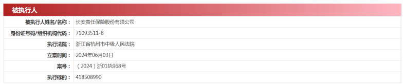 今年6月3日,杭州市中级人民法院依法立案执行,执行标的为4.185亿元及债务利息,执行费为48.4万元。由此,法院裁定,查封、冻结、扣押、扣留、划拨、提取长安保险4.19亿元及债务利息或相应价值的其他财产。现金不能履行的部分,则通过拍卖、变卖长安保险名下相应价值的财产以清偿债务。