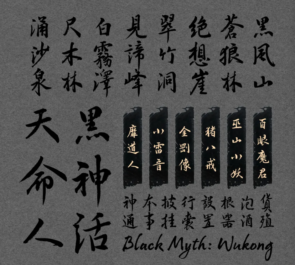 汉仪黑神话整体字形取自行楷书法,笔法凌厉,字体中宫收紧,笔画开张,书写风格取欧体行楷劲峭、险峻之神韵,一如悟空“肉在里面,骨在外面”,贴合整体游戏风格;在BOSS关卡,章节介绍中,字体的出现或险峻,或平缓,犹如一本缓缓铺开的古籍善本,让人沉浸其中。