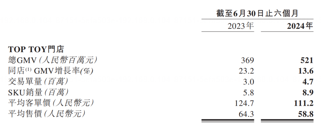 TOP TOY方面,截至2024年6月30日的门店总数已增至195家,上半年净增47家,其中包括21家直营店和174家合伙人门店。门店总GMV达5.21亿元,同比增长41%,同店销售也增长了13.6%。不过,平均客单价则由去年同期的124.7元降至111.2元。