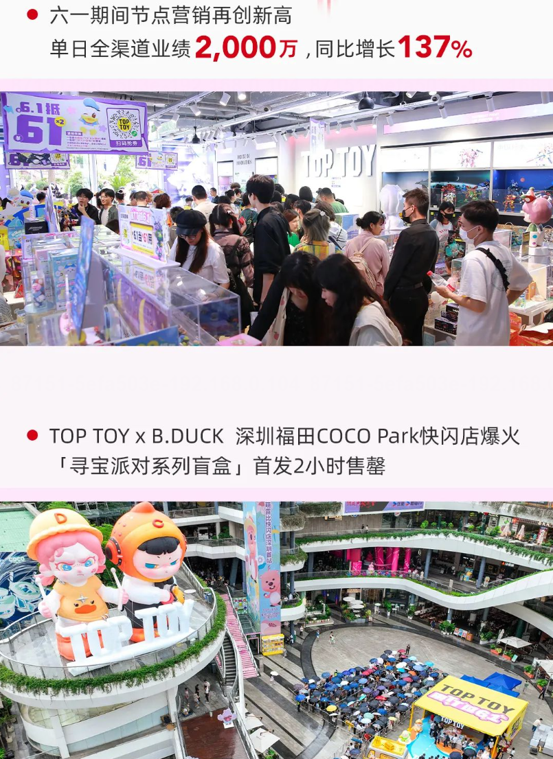 今年六一儿童节,TOP TOY举办的第四届“六一潮玩节” 联合全国187个核心商圈,以全国门店为窗口,结合IP巡游、主题快闪、新品签售等多元活动,掀起了一场超过80万用户“来TT 过61”的节日狂欢,创下了全渠道单日销售额破2000万的业绩,同比增长137%。与B.duck在深圳福田COCO Park打造的联名快闪店进行的【寻宝派对系列盲盒】首发签售会,现场排队超过1000人,系列盲盒首发两小时即售罄,门店单日业绩突破70万元。