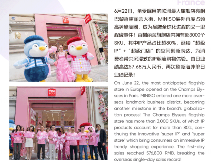 此外,名创在欧洲最大的旗舰店于今年6月22日亮相法国巴黎香榭丽舍大街,该旗舰店拥有3000个SKU,其中IP产品占比超80%,首日业绩高达57.68万元,刷新名创优品海外单日业绩记录。