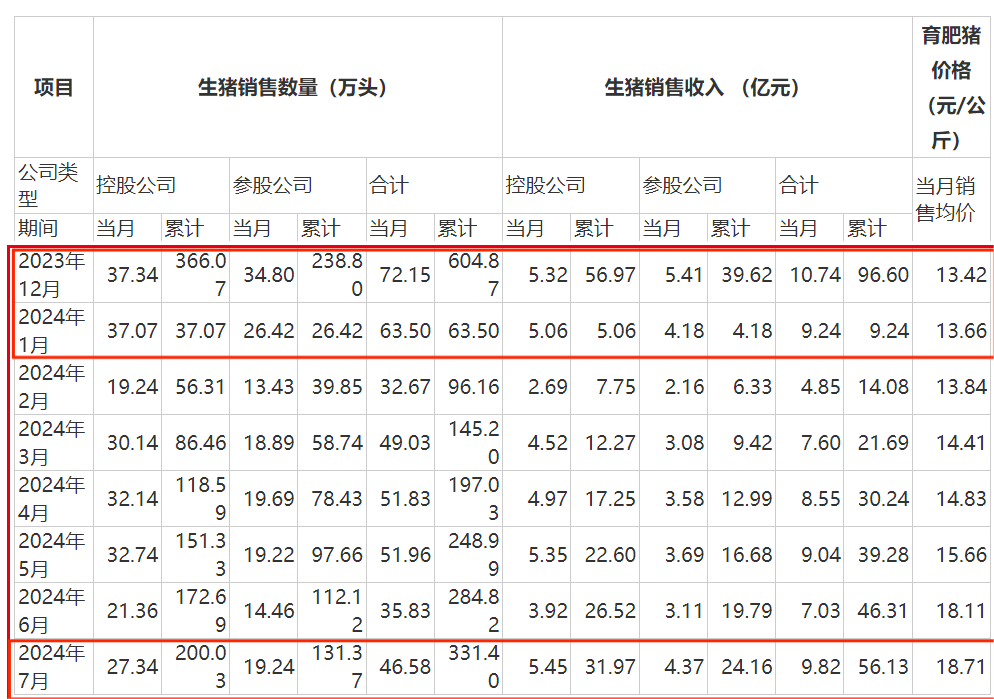 2024年1月,大北农的育肥猪价格为13.66元/公斤,环比上涨1.79%。自此,育肥猪价格一路走高,到2024年7月时,价格已经上涨至18.71元/公斤,较1月份上涨约37%。