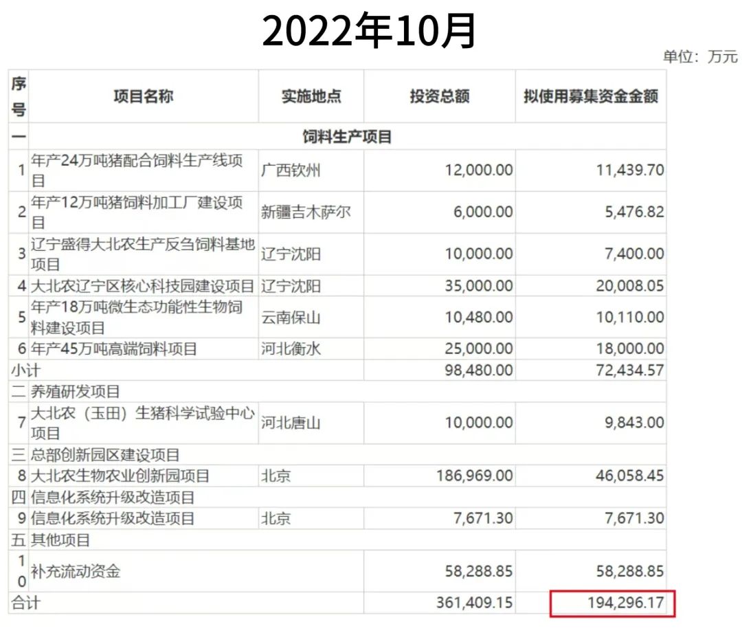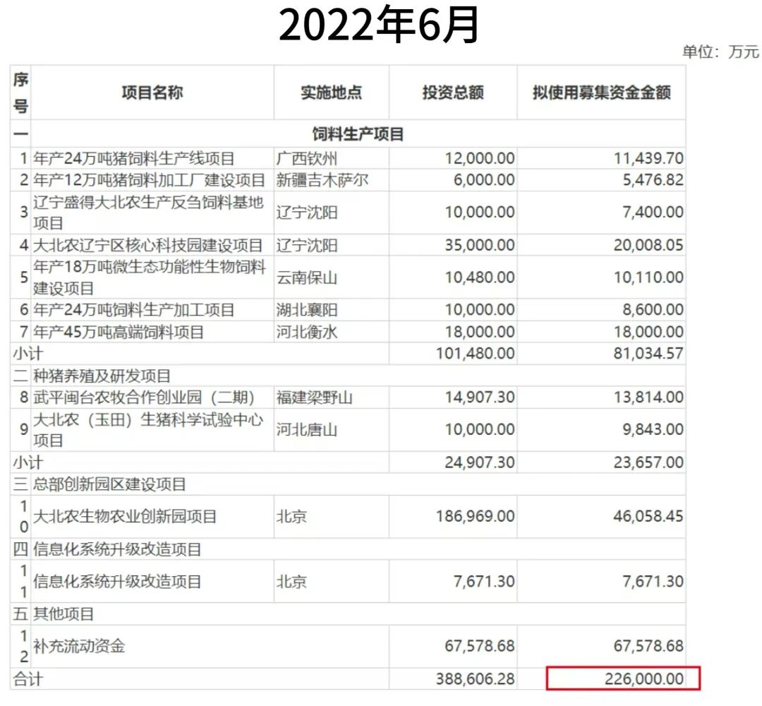 据「创业最前线」不完全统计,早在2022年6月,大北农就披露了定增预案,计划募资不超过22.6亿元。4个月后(即10月),将募资金额上限下调至19.43亿元。