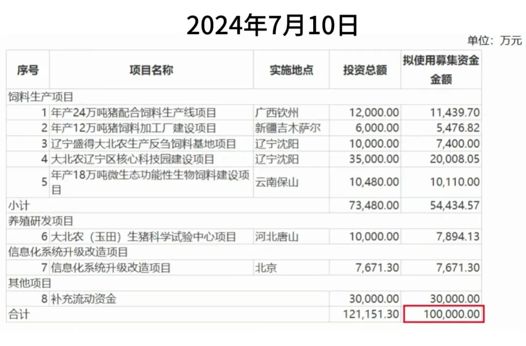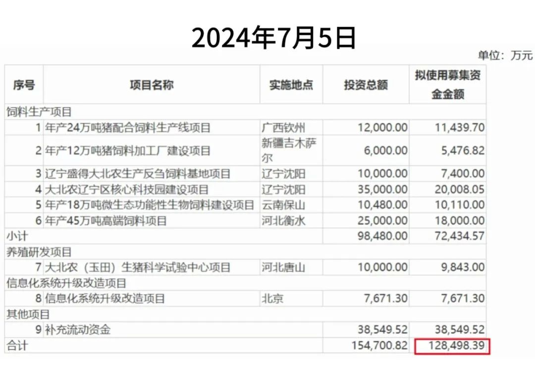 2024年7月5日,大北农将募资金额上限进一步下调至12.85亿元;7月10日,又将募资金额下调至不超过10亿元。