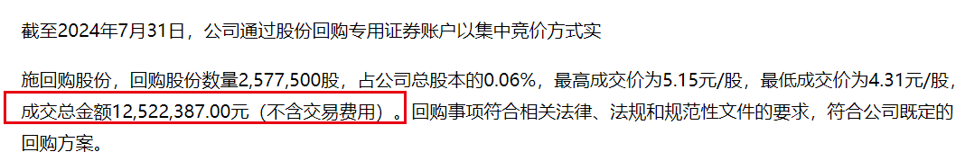 数据显示,截至2024年7月31日,公司以集中竞价方式实施回购股份,回购股份数量257.75万股,成交总金额1252.24万元(不含交易费用)。