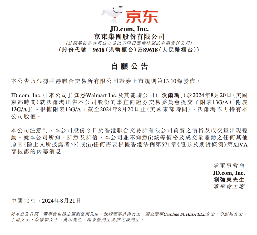 8月21日,京东就沃尔玛出售股权发布公告,公告显示,截至美国时间8月20日,沃尔玛已不再持有京东股权。
