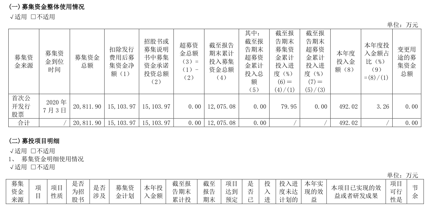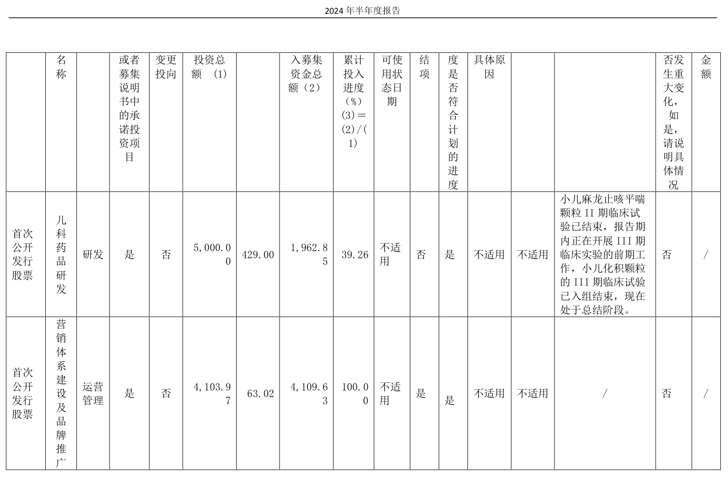 葫芦娃上市4年,分红2次,上市头年有一次10派1.5元分配计划,分红总额6001.63万元;2024年实施了一次10派1.25元,分红金额6001.36万元。融资方面,公司首发时融资净额1.51亿元,承诺投资额1.51亿元,截至2024年6月末投了1.21亿元,完成进度79.95%。其中,“儿科药品研发”项目的进度39.26%,“营销体系建设及品牌推广”项目进度为100%。葫芦娃称,小儿麻龙止咳平喘颗粒II期临床试验已结束,报告期内正在开展III期临床实验的前期工作,小儿化积颗粒的III期临床试验已入组结束,现在处于总结阶段。