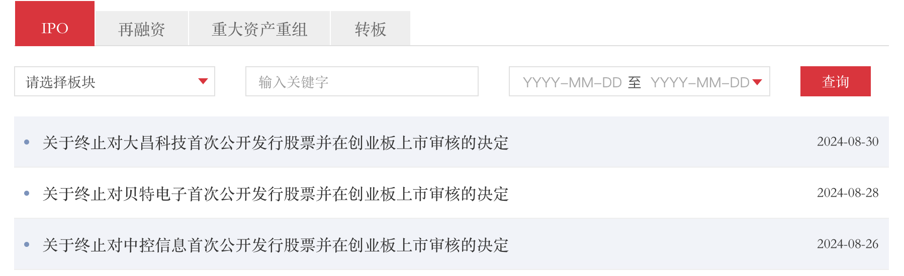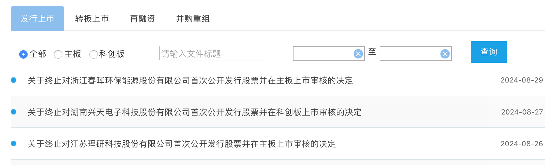 根据沪深交易所的信息更新,8月26日至30日这周,放弃冲沪市主板的有江苏理研科技股份有限公司、浙江春晖环保能源股份有限公司(下称春晖能源),放弃闯科创板的有湖南兴天电子科技股份有限公司(下称兴天科技),而浙江中控信息产业股份有限公司(下称中控信息)、安徽大昌科技股份有限公司、东莞市贝特电子科技股份有限公司这3家公司(下称贝特电子),则放弃了跻身创业板的计划。