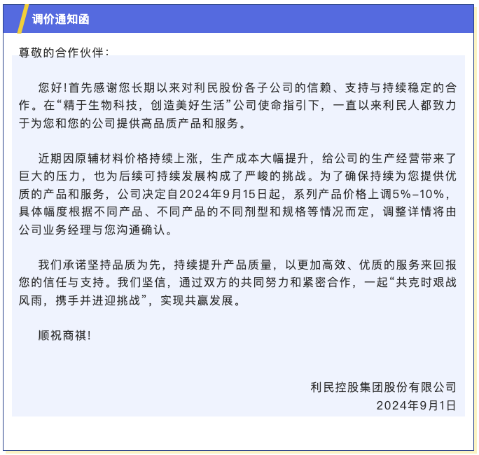 9月1日,利民控股集团股份有限公司发布调价通知函:近期因原辅材料价格持续上涨,生产成本大幅提升,公司决定自2024年9月15日起,系列产品价格上调5%-10%,具体幅度根据不同产品、不同产品的不同剂型和规格等情况而定。