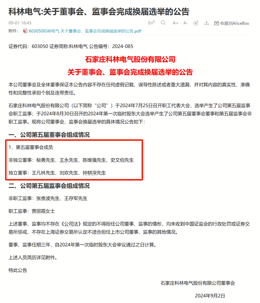 9月1日,靴子落地。科林电气发布第五届董事会成员名单的公告显示,海信网能方面提名的人选中4人当选,石家庄国投提名的人选中有3人当选。