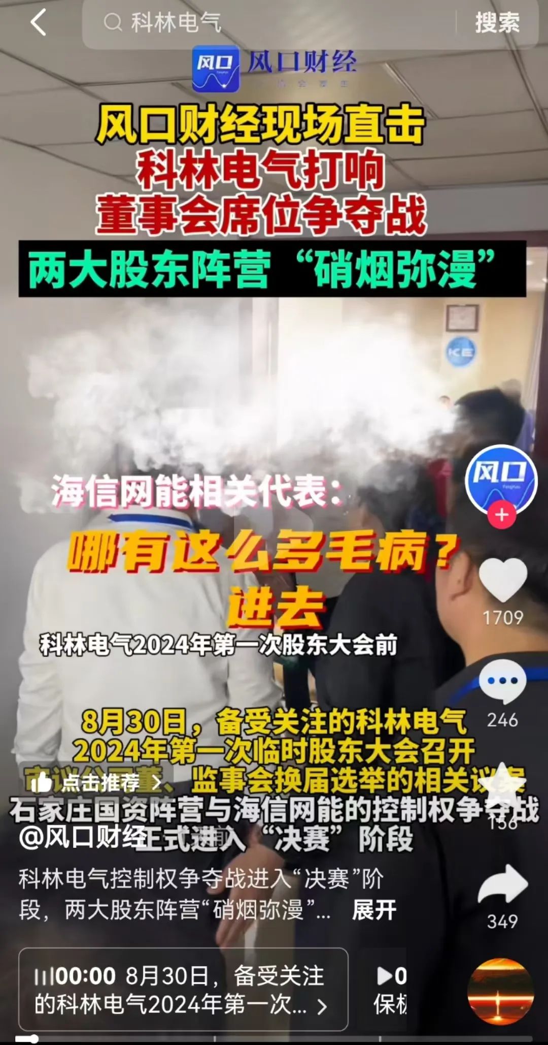 海信网能和石家庄国投作为科林电气控股权争夺战中,剩下来的两股主要力量,均派代表参加了会议。双方从线上隔空PK,首次转至线下公开对阵。