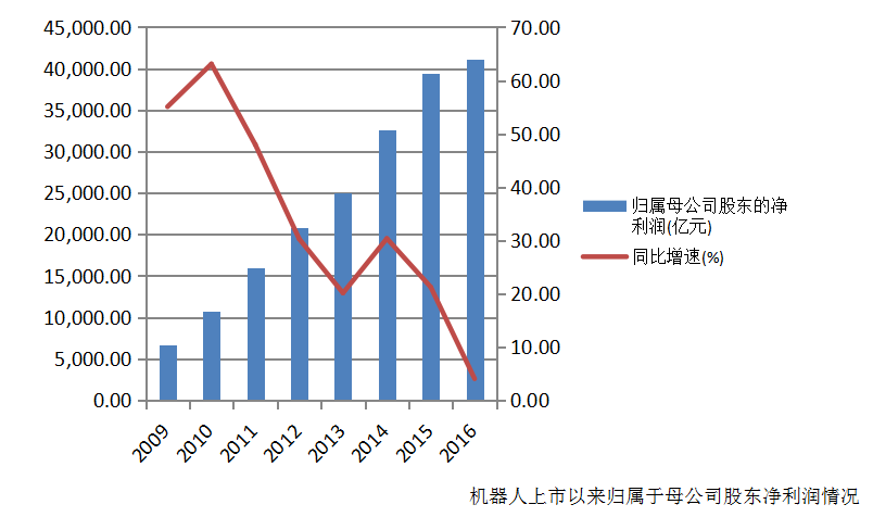 一方面,公司2015年通过出售持有的600万股欣泰电气(300372.SZ),获得投资收益6413万元,直接占到当年归属于母公司股东净利润的16.24%;而到了2016年,公司全年依靠出售金融资产获得的投资收益只有768万元,仅占公司归属于母公司股东净利润的1.87%。假设2015年和2016年均扣除掉这块投资收益,那么机器人2016年归属于母公司股东的净利润将同比增加21.90%。