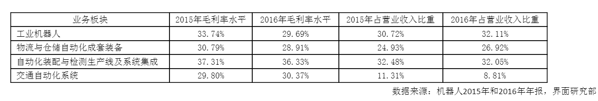 按照上述数据及三大主营业务各自2015年和2016年的营业收入进行计算,相比于2015年,2016年工业机器人、物流与仓储自动化成套装备和自动化装配与检测生产线及系统集成三大板块实际增加毛利分别为1913万元、2890万元和3253万元。