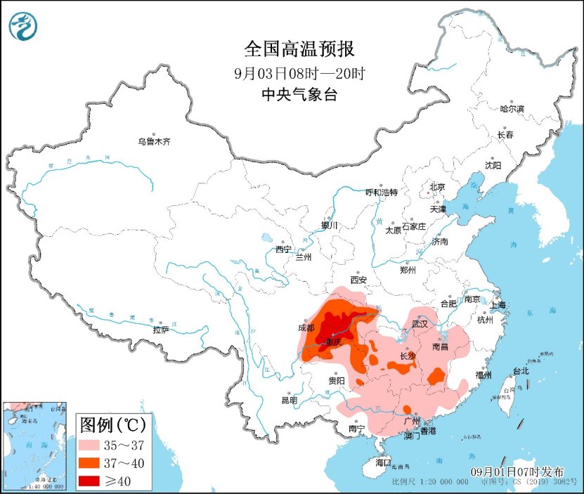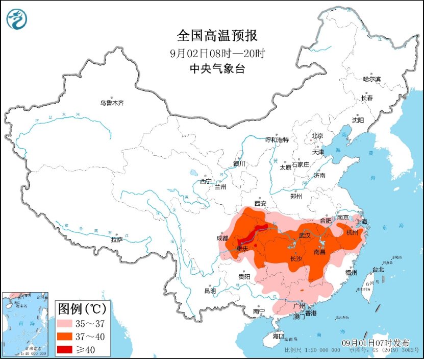 今天白天,陕西南部、河南中南部、安徽大部、湖北、湖南大部、江西大部、浙江中西部、四川东部、重庆、贵州东北部等地部分地区最高气温37~39℃,重庆东北部和西部、湖北西部局地可达40℃以上。中央气象台今晨继续发布高温黄色预警。