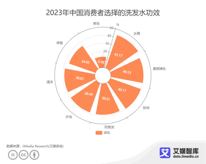 iiMedia Research(艾媒咨询)数据显示,在2023年中国消费者选择的洗发水功效中,最为关注的是去屑功效,占比高达43.17%。紧随其后的是柔顺弹性、控油,分别有40.53%、40.17%的消费者选择。此外,防脱发和护发也是消费者关注的重点,分别有38.61%和38.49%的消费者选择了这些功效。