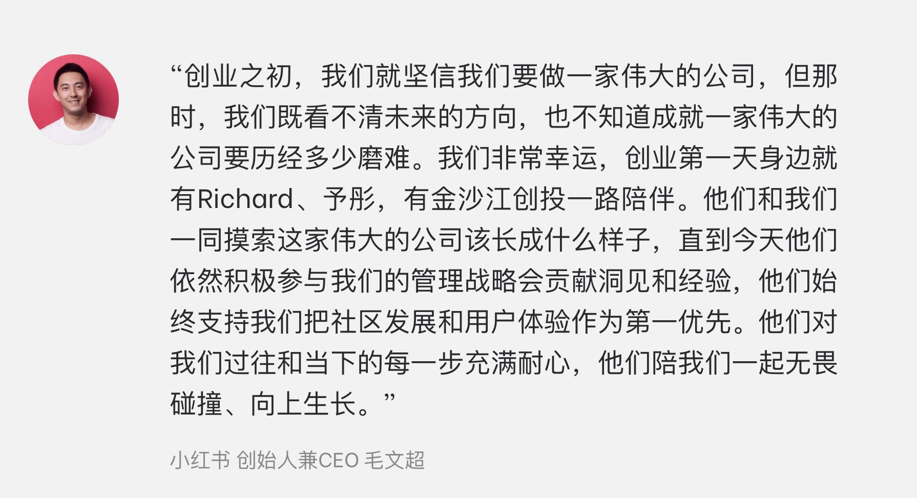“创业之初,我们就坚信我们要做一家伟大的公司,但那时,我们既看不清未来的方向,也不知道成就一家伟大的公司要历经多少磨难。我们非常幸运,创业第一天身边就有Richard、予彤,有金沙江创投一路陪伴。他们和我们一同摸索这家伟大的公司该长成什么样子……”金沙江创投的官网上,挂着毛文超写下的这段话。