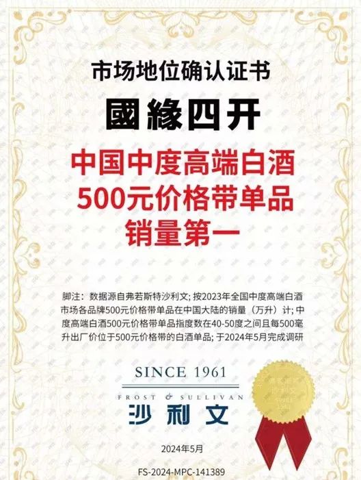 据媒体相关报道,弗若斯特沙利文调研数据显示,按2023年全国中度高端白酒市场各品牌在中国大陆的销量(万升)计,“国缘四开”夺得中国中度高端白酒500元价格带单品销量第一。