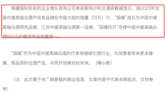 不仅与其他单品对比的销量数据没有明确公示,而且评选标准还限定了几个重要的先决条件——“中度高端白酒”“500元价格带”“度数在40-50度之间”。也就是说,只有符合上述条件的白酒单品,才有和国缘四开争“第一”的资格。