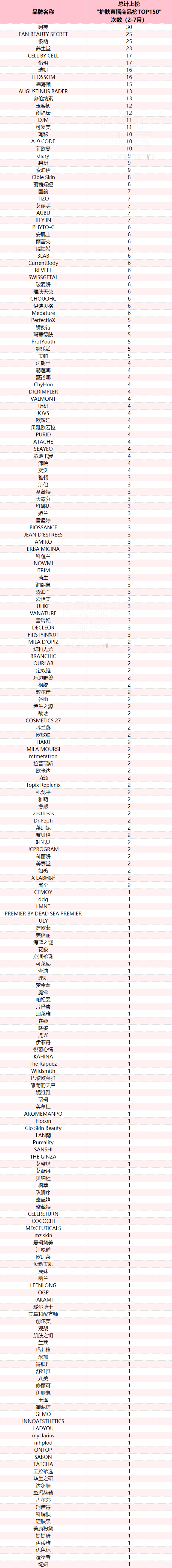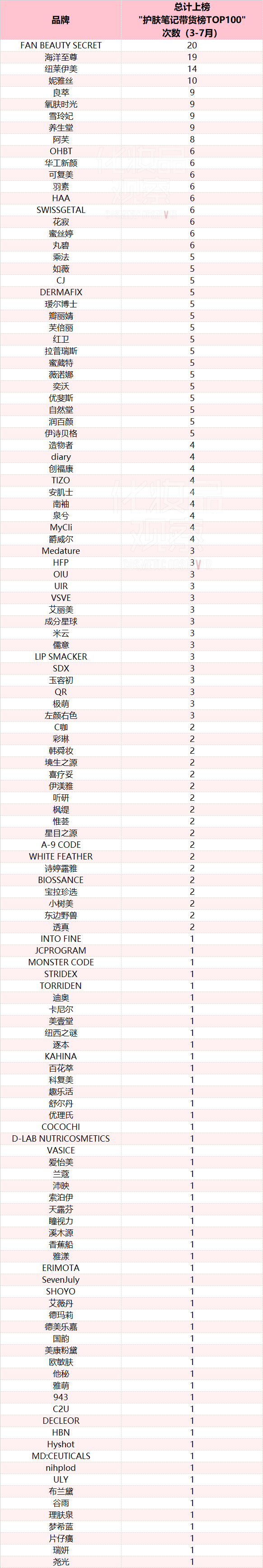 其中,FAN BEAUTY SECRET上榜次数最多,达20次;海洋至尊、纽莱伊美、妮雅丝上榜次数均超过10次;上榜次数超5次的品牌有34个,意味着它们月均上榜1次。