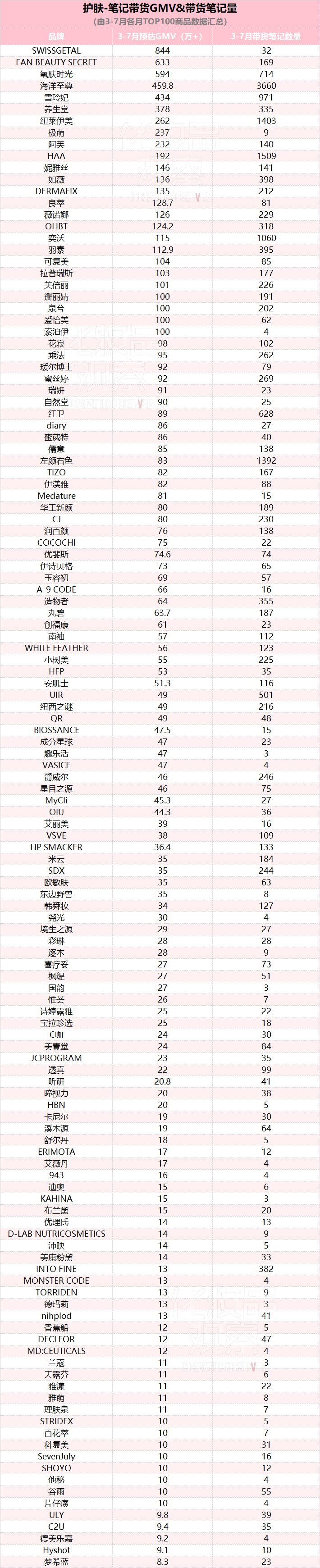 3-7月,护肤类目总计有130个品牌(系统未显示品牌名的,不计入其中,下同)的商品,上榜过月度笔记带货榜TOP100,上榜的预估GMV门槛是8万+。