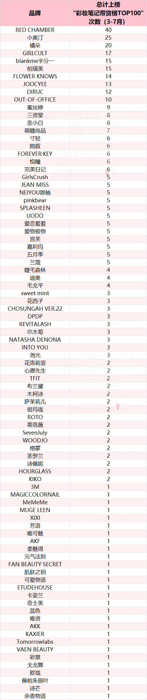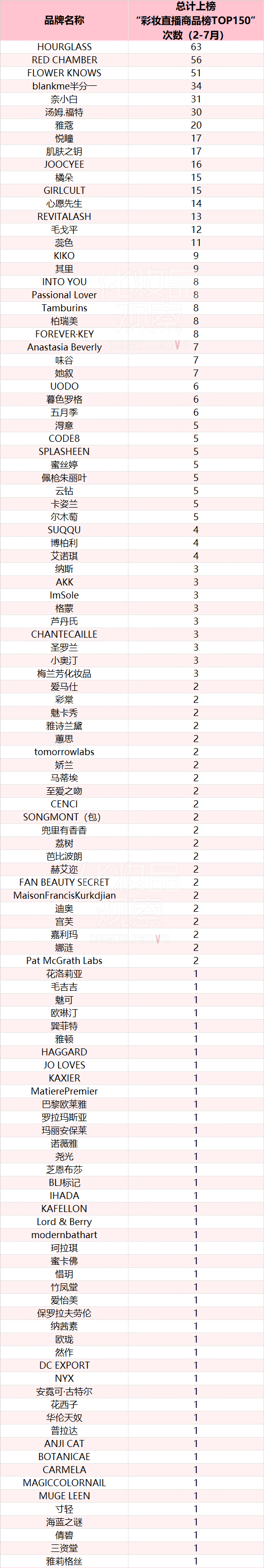 其中,联合利华旗下品牌HOURGLASS上榜了63次;RED CHAMBER朱栈、花知晓也均上榜超50次;上榜超10次的品牌有16个。