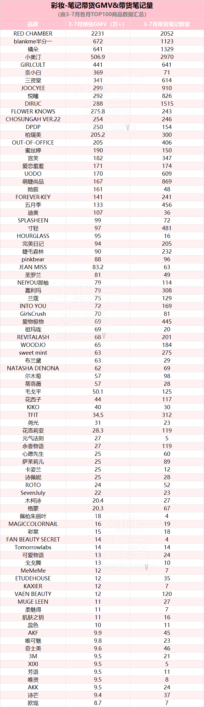 彩妆类目,3-7月总计有87个品牌的商品,上榜过月度笔记带货榜TOP100,上榜的预估GMV门槛也是8万+。
