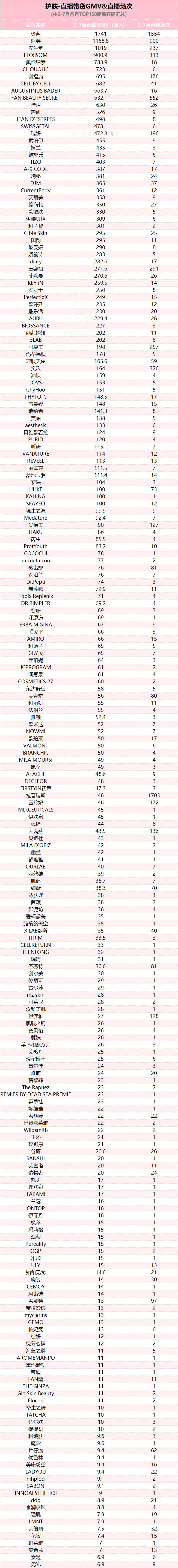 2-7月,护肤类目共计216个品牌的商品,上榜过月度直播商品榜TOP150,上榜门槛是6.4万+。