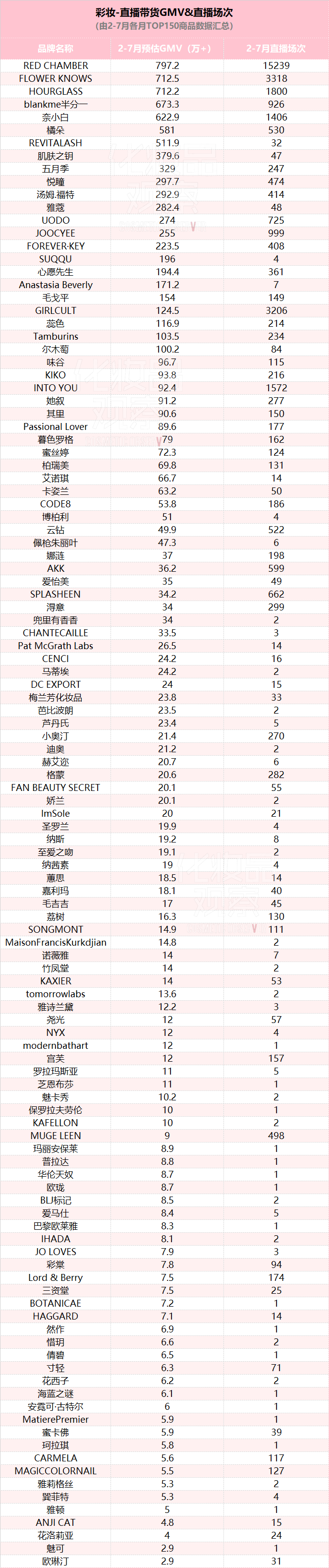 彩妆类目,2-7月总计有117个品牌的商品,上榜过月度直播商品榜TOP150,上榜门槛是2.6万+。