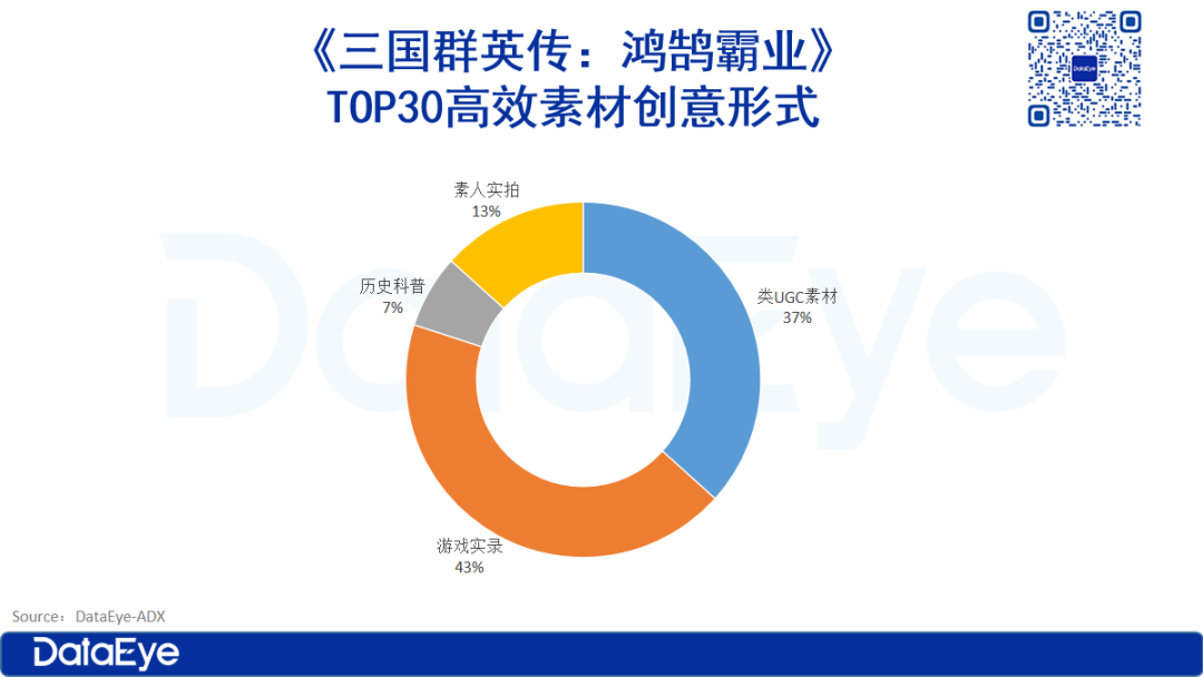 DataEye研究院整理了《三国群英传:鸿鹄霸业》投放计划数TOP30的高效素材,其投放素材创意形式中,游戏实录占比最高,达43%;其次是类UGC素材,占比37%;素人实拍和历史科普占比13%和7%。