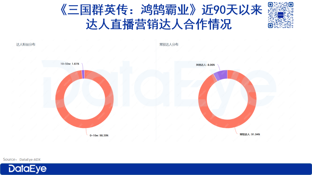 直播方面,近90天《三国群英传:鸿鹄霸业》项目组合作达人0-10W粉丝的中腰部主播占比高达98%左右,10-50W粉丝的头部主播占比1.6%左右;《三国群英传:鸿鹄霸业》常驻达人占比达91.9%。