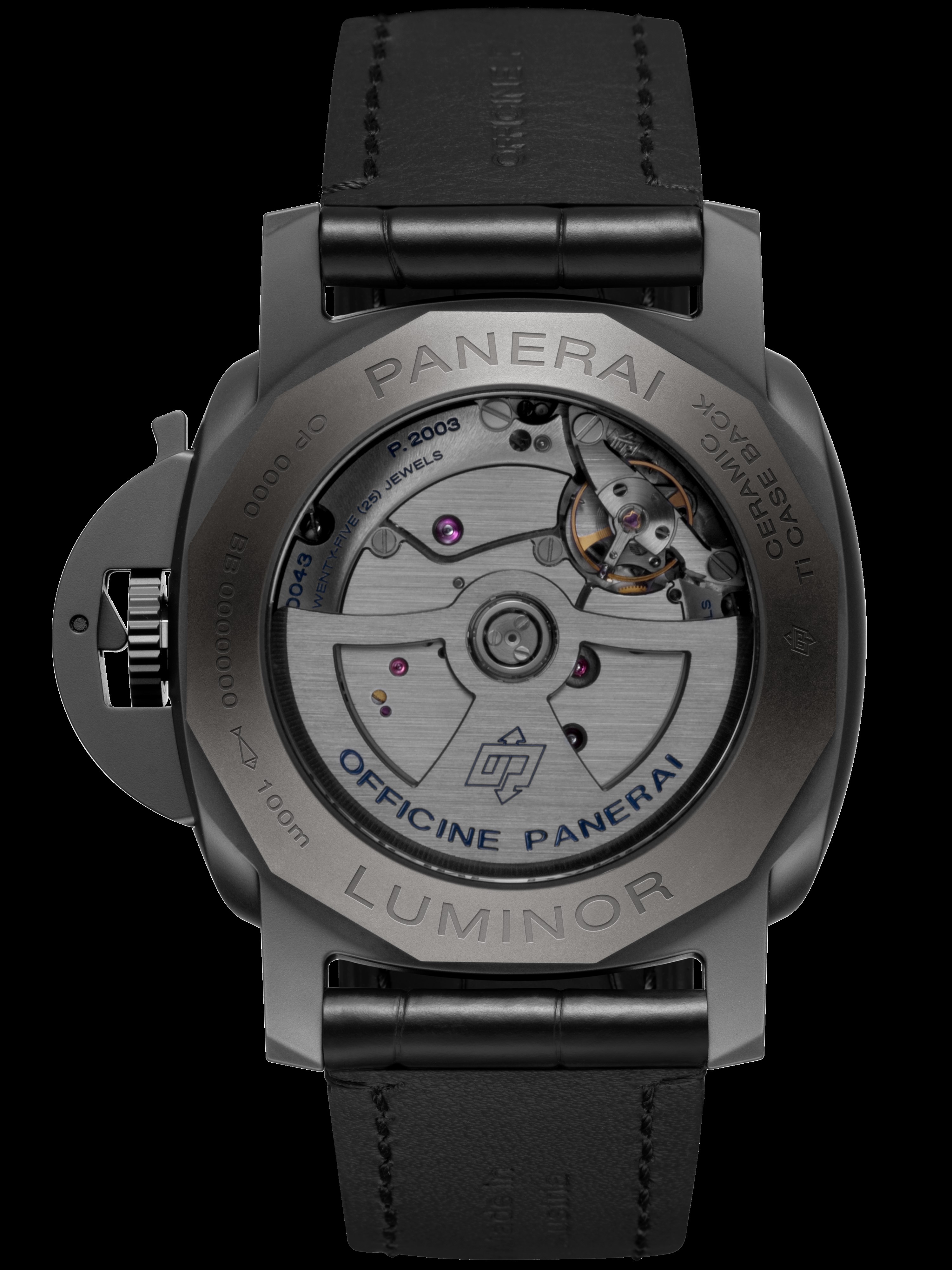 这款腕表搭载了沛纳海自主研发的P.2003自动上链机芯,该机芯在瑞士纳沙泰尔制表厂制作,具备长达10天的动力储备能力,通过表盘上的线性指示器可以直观了解剩余动力。此外,它还集成了日期显示、摆轮掣停、秒针归零以及双时区与昼夜显示功能,是一枚多复杂功能腕表。