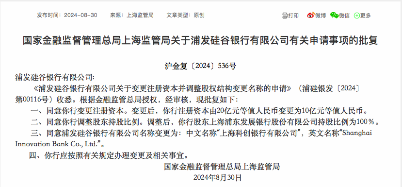 8月30日,国家金融监管总局上海监管局官网信息显示,该局批复核准了浦发硅谷银行关于变更注册资本并调整股权结构、变更名称的申请。