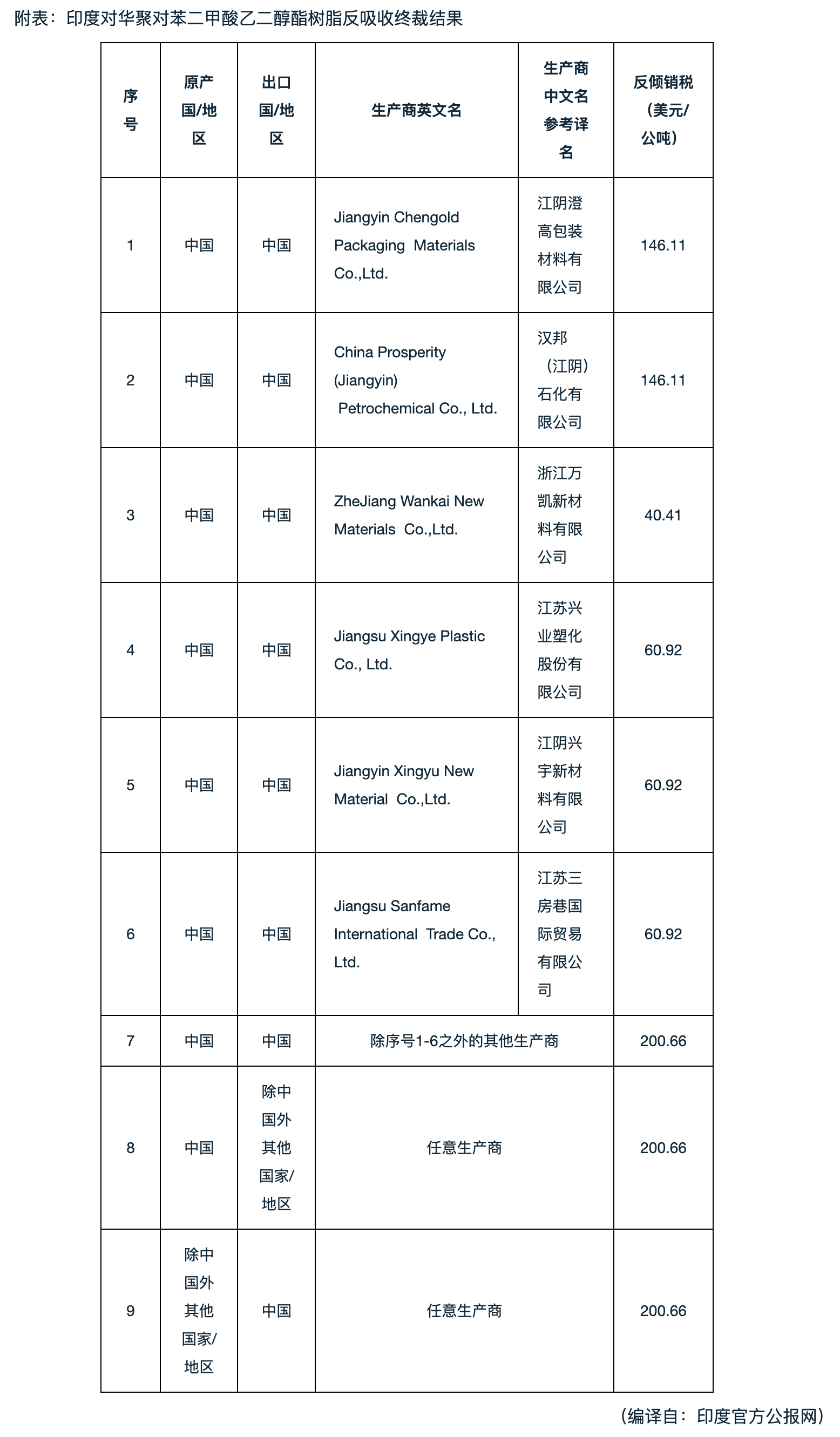 2019年10月1日,印度商工部发布公告称,应印度企业IVL Dhunseri Petrochem Industries Private Limited 和Reliance Industries Limited提交的申请,对原产于或进口自中国的特性粘度≥0.72分升/克的聚对苯二甲酸乙二醇酯树脂启动反倾销调查。2020年12月28日,印度商工部对该案作出反倾销肯定性终裁。2021年3月27日,印度财政部发布第18/202 1-Customs (ADD) 号通报,决定对中国涉案产品征收为期5年的反倾销税,其中万凯新材料股份有限公司为15.54美元/公吨,其他中国出口商为60.92~200.66美元/公吨。措施有效期至2026年3月26日。