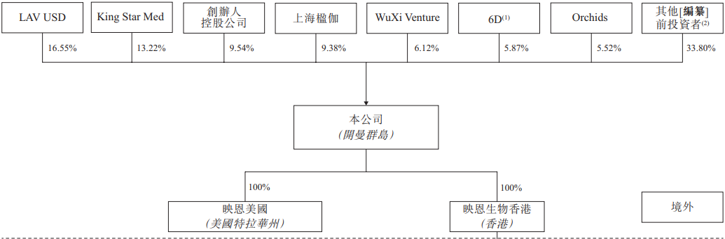 最新股权结构显示,映恩生物创始人控股公司持股9.54%,礼来LAV USD持股16.55%,King Star Med持股13.22%,上海楹联持股9.38%,药明生物(02269.HK)通过旗下WuXi Venture持股6.12%,6D Capital(通和毓承)持股5.87%,其他投资者持股33.8%。