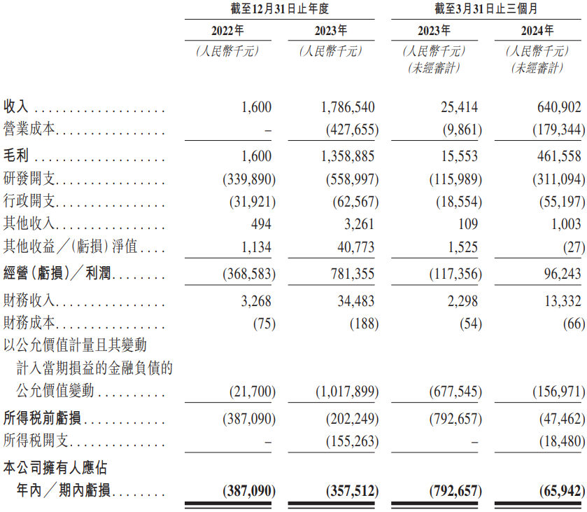 于2022年、2023年以及2024年前三月,该公司与研发活动有关的成本及开支(即营业成本及研发开支)分别为3.4亿元、9.87亿元及4.9亿元。