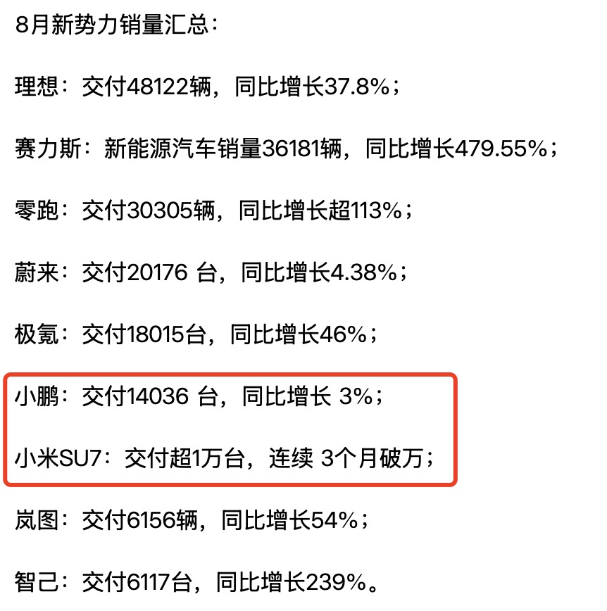 图/2024年8月小鹏与小米销量 来源/张大喵说车