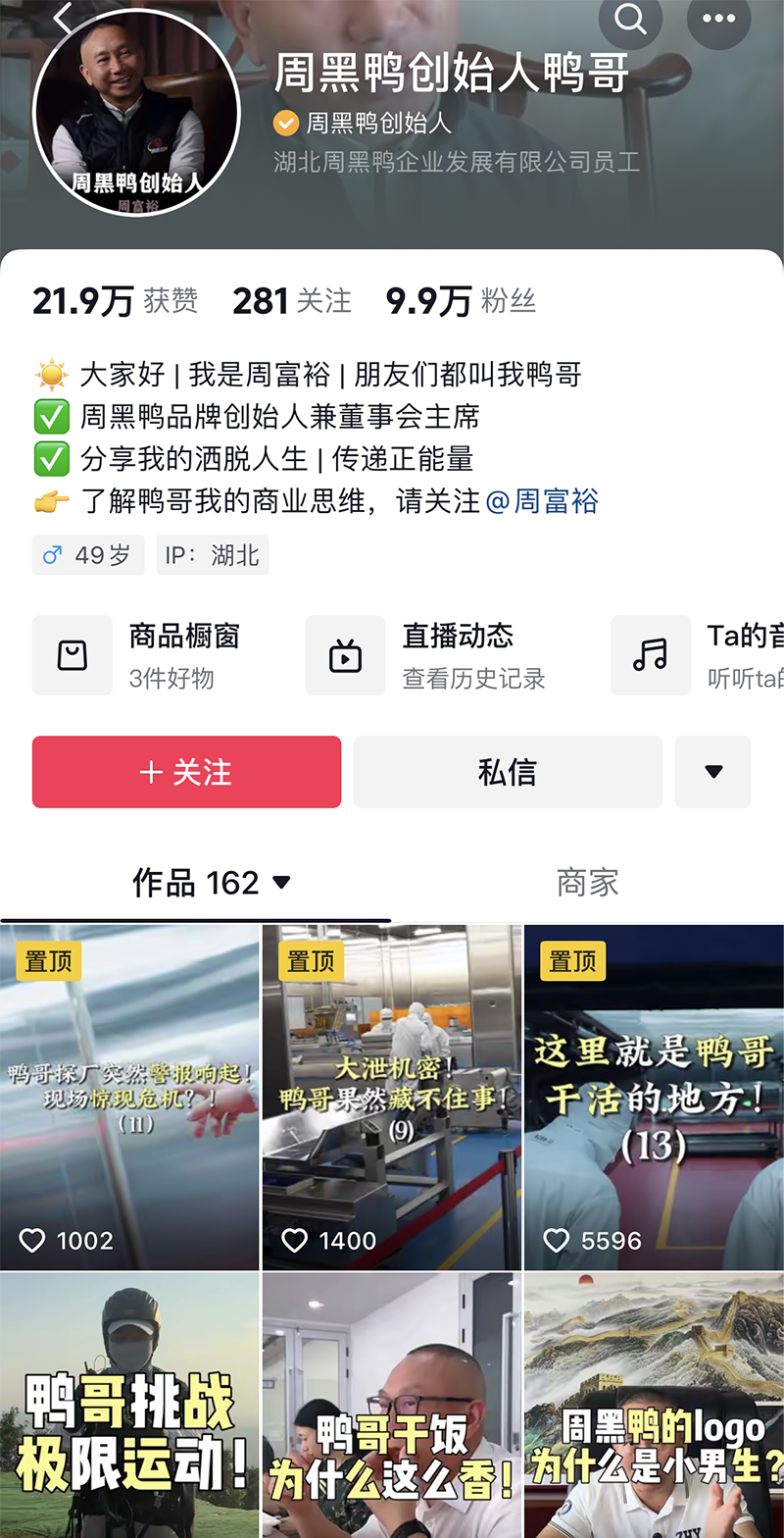 截至8月28日,抖音上,其个人IP“周黑鸭创始人鸭哥”账号共发布162条短视频内容,其中有150多条是在今年发布的,内容涉及个人创业史,日常巡店、探访周黑鸭工厂等一系列主题。