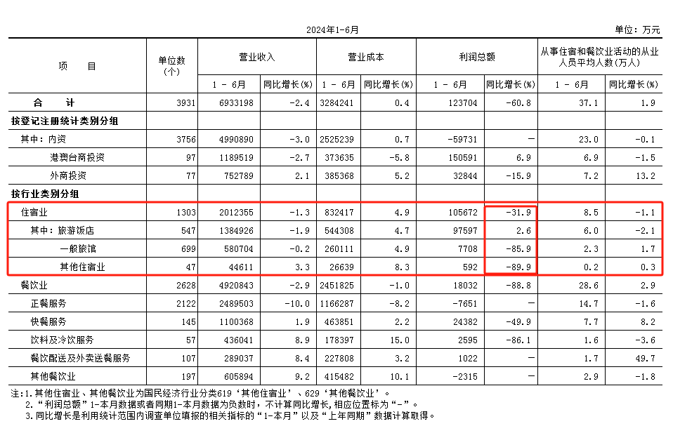 《酒管财经》了解到,住宿业限额标准为年主营业务收入在200万元及以上。简单计算,今年上半年被统计的住宿业单位利润率为5%。