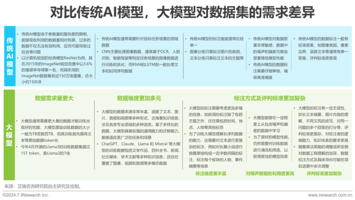 算法模型从理论到实践的应用过程依赖于大量的训练数据。训练数据越多、越完整、质量越高,模型推理的结果就越可靠。在本报告的讨论中,传统AI泛指Transformer架构出现之前的AI架构,参数量通常相对较小,大模型架构则以Transformer为代表。作为应用大模型架构的代表,ChatGPT在2022年11月上线以来,掀起了AI乃至社会经济各领域对大模型的研讨与应用的热潮。与传统AI相似,大模型依然需要大量优质数据,但其所需数据量更大,数据维度更加多元,标注方式及质量评判标准也更为复杂多样。